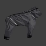 • Long, full 4-leg coverage, high neck, adjustable cuffs and back vent for leash.