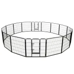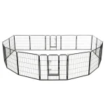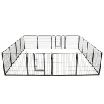 This dog kennel can be easily set up or taken down. It consists of 16 heavy-duty panels and each panel can be easily attached to the next, which allows you to configure the playpen in different shapes. The dog enclosure features two hinged doors with security latches for easy access. This durable and weather-resistant dog playpen is made of rustproof powder-coated steel, making it suitable for outdoor and indoor use. The included ground stakes help secure the playpen outdoors for added stability and security.