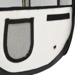 This playpen, with the dimensions of 57.1″x57.1″x24″, is perfect for using at home or travelling. It includes a carrying bag for convenient storage. It is lightweight and yet very sturdy, thanks to the strong steel frame. The mesh roof and door can be opened or closed quickly with the zipper. The side nets ensure good air circulation and great visibility. Additionally, the side pockets are suitable to keep small items, like toys. This run cage can be easily stored with its foldable design when not in use.